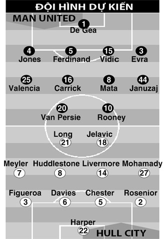 Trong khi đó, M.U có sự trở lại của Wayne Rooney sau thời gian bị ốm. Mới đây, tiền đạo 28 tuổi này đã tái xuất trên sân tập cùng đồng đội. Những bước chạy nhẹ nhàng của Rooney cho thấy anh gần như không còn gặp vấn đề gì về sức khỏe. Ở trận gặp Hull đêm nay, HLV tạm quyền Ryan Giggs sẽ lần đầu tiên có trong tay hai tiền đạo xuất sắc Rooney - Robin van Persie ở đội hình xuất phát.