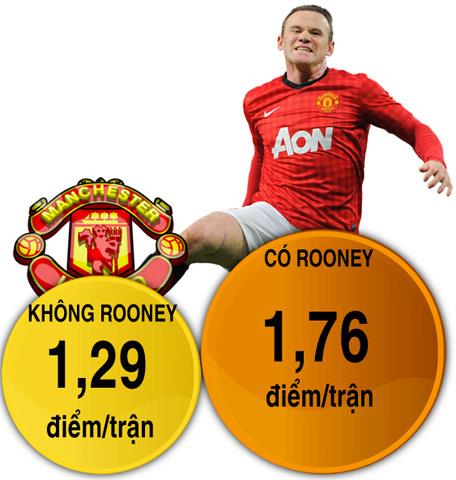 Mùa này, Man United chỉ giành được 9 điểm trong 7 trận đấu Rooney vắng mặt tại Premier League. Tính ra, trung bình mỗi trận Rooney không ra sân, Quỷ đỏ chỉ giành được 1,29 điểm. Trong khi, nếu có chân sút này, Man United giành được 1,76 điểm/trận.