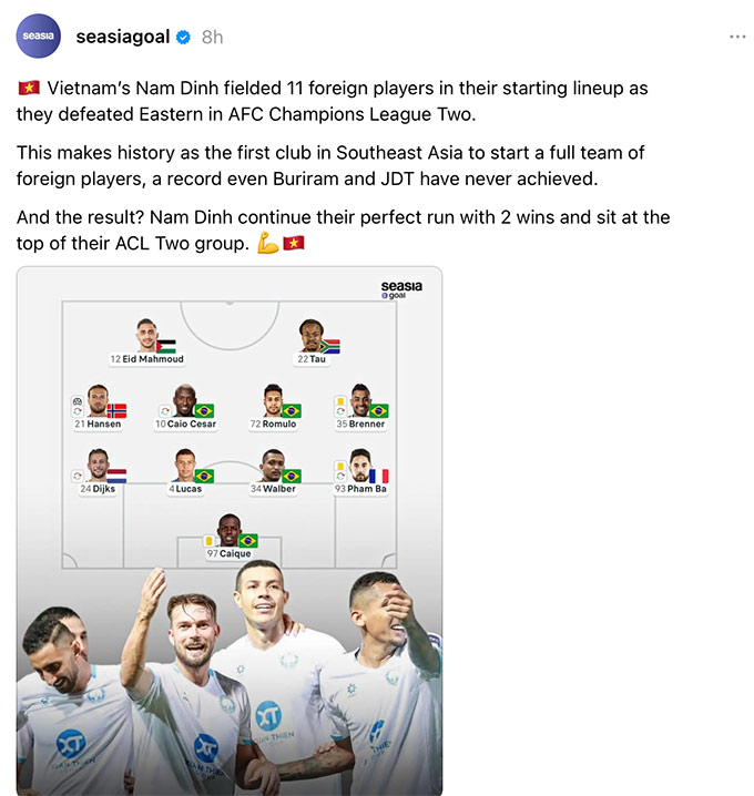 Trang Seasiagoal bình luận trên mạng xã hội Thread bình luận: “Kỷ lục mà ngay cả những đội hàng đầu khu vực như Buriram (Thái Lan) hay Johor Darul Tazim (Malaysia) cũng chẳng thể bì nổi. Kết quả thì sao? Nam Định có chiến thắng thứ 2 liên tiếp và đứng đầu 1 bảng đấu tại AFC Champions League Two”.