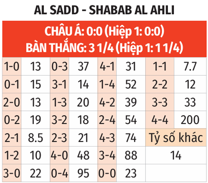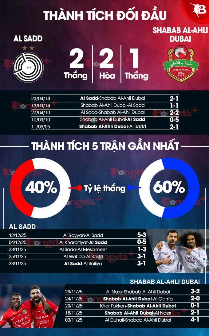 - Hai đội cùng ghi bàn: Al Sadd và Shabab Al-Ahli Dubai đã thành công trong việc ghi bàn ở 4/5 trận gần nhất. Ngoài ra, Al Sadd còn làm được điều đó ở 7 trận vừa qua trên sân nhà còn Shabab Al-Ahli Dubai là ở 6/7 trận mới đây trên sân khách. Với xu hướng như vậy, khả năng cao hai đội sẽ cùng tìm được đường vào khung thành của nhau.