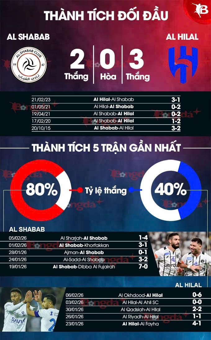 - Hiệp 1 có bàn thắng: 10 trận liên tiếp của Al Shabab cùng 10/11 trận vừa qua của Al Hilal đều có ít nhất 1 bàn trong hiệp 1. 4/5 trận đối đầu gần nhất cũng có bàn thắng trong 45 phút đầu tiên, với 3 trận xuất hiện tối thiểu 2 bàn. Với những gì hai đội đã và đang thể hiện, có thể chờ tổng bàn thắng hiệp 1 giảm về 1 hòa để cổ vũ mưa bàn thắng.