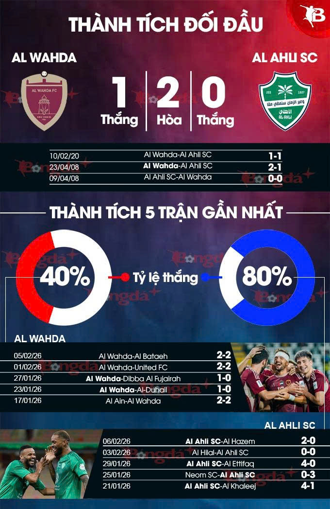 - Al Ahli thắng châu Á: Đội khách Al Ahli bước vào trận đấu này với mạch 7 trận không thua châu Á, trong đó có 4 chiến thắng và 3 trận hòa. Với Al Wahda, đội chủ nhà toàn thua châu Á 3 trận liên tiếp gần đây.