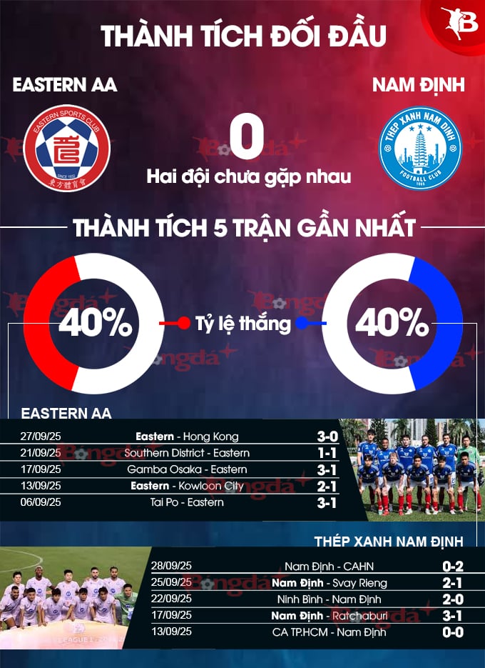 Eastern có lợi thế sân nhà khi tiếp đón Nam Định. ĐKVĐ V.League có thể gây thất vọng ở giải quốc nội nhưng khi ra giải quốc tế, họ có thể được sử dụng đội hình gồm toàn bộ ngoại binh. Chính đội hình gồm nhiều ngoại binh chất lượng đã giúp Nam Định chơi áp đảo và có chiến thắng 3-1 trước Ratchaburi ở trận khai màn. Trước đối thủ “vừa miếng” của Hong Kong, Nam Định nhiều khả năng sẽ tiếp tục bỏ túi thêm 3 điểm.