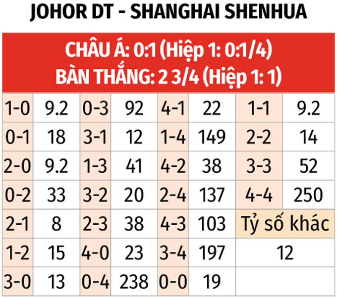 - Johor DT thắng châu Á: Trên sân nhà của mình, Johor DT đang có thành tích thắng 18/20 trận trên mọi đấu trường. Theo châu Á, Johor DT thắng châu Á 3, hòa 1 và thua 1 trong 5 trận sân nhà gần nhất tại AFC Champions League. Với Shanghai Shenhua, đội bóng Trung Quốc thua châu Á 4/6 trận sân khách vừa qua và thua 4 trận xa nhà liên tiếp tại AFC Champions League.