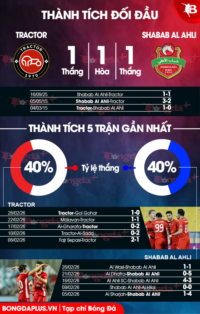 Bằng chứng là trong 5 trận vừa qua ở sân chơi châu lục, Shabab Al Ahli chỉ hạ được 1 đối thủ mà phải nhận 3 thất bại. Về phần mình, Tractor lại mới thắng 4/5 trận gần nhất ở Champions League Elite.