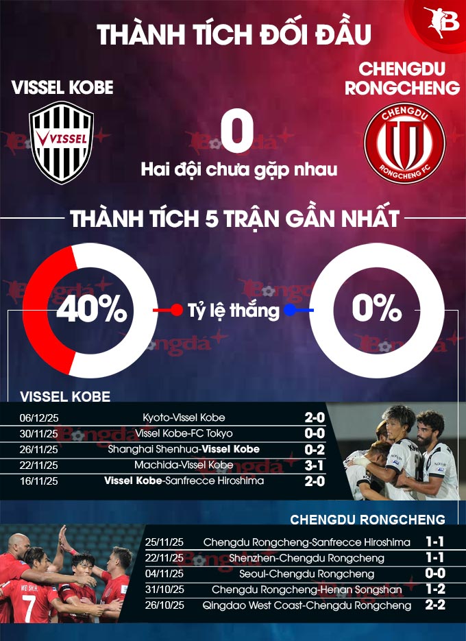 - Ít bàn thắng: 6/7 trận gần đây của Vissel Kobe đều kết thúc với nhiều nhất 2 bàn thắng được ghi. Bên phần sân đối diện, 3 trận liên tiếp vừa qua của đội khách Chengdu Rongchen cũng xuất hiện tối đa 2 pha làm bàn.