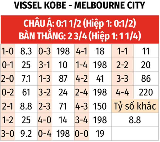 - Vissel Kobe thua châu Á: Thị trường niêm yết tỷ lệ Vissel Kobe nhường đối thủ 1 1/4 trái, đây là mức tỷ lệ mà đội bóng Nhật Bản không có duyên, khi 4 trận gần nhất xuất hiện họ đều khiến các nhà đầu tư ôm hận và đều là những trận được chơi trên sân nhà. Với Melbourne City, đội bóng này thắng châu Á 3/5 trận sân khách vừa qua.