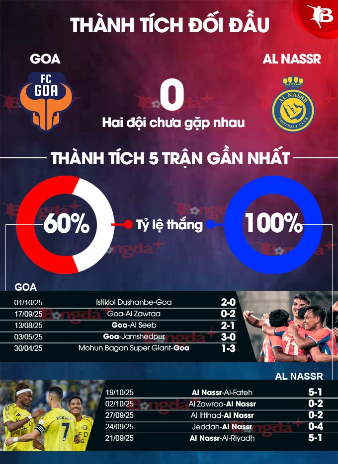 Phong độ của Goa vs Al Nassr đang có sự chênh lệch. Cụ thể, trong khi Goa chỉ thắng 3/5 trận gần đây thì Al Nassr toàn thắng 5 trận gần nhất. Có thể, Goa có lợi thế sân nhà - nơi họ chỉ thua 1/10 trận vừa qua - nhưng Al Nassr lại toàn thắng sân khách kể từ khi mùa giải mới tranh.