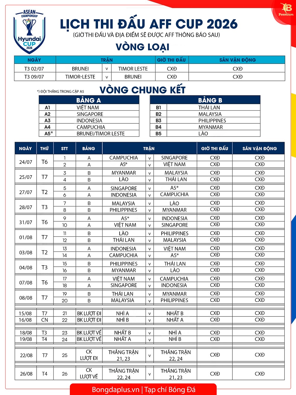 Tại vòng bảng AFF Cup 2026, Việt Nam cùng bảng với Singapore, Indonesia, Campuchia và đội thắng trong cặp play-off giữa Brunei và Timor Leste.