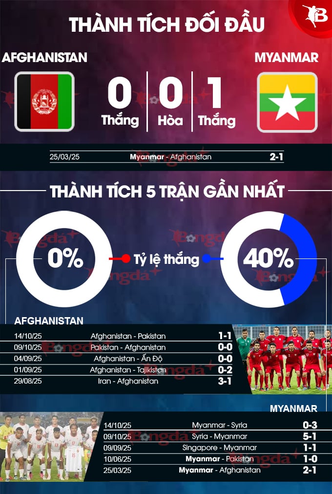 Lịch sử đối đầu cũng nghiêng về Myanmar khi họ toàn thắng trong lần gặp gần nhất. Tuy nhiên, phong độ của cả hai đội đều không ổn định. Afghanistan có lợi thế sân nhà và sẽ chơi với quyết tâm cao nhất để níu kéo hy vọng.