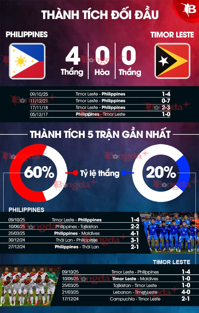 • Tối đa 9 phạt góc: 5/5 trận gần nhất của Philippines có tối đa 7 phạt góc. 10/10 trận gần nhất của Timor Leste có tối đa 9 phạt góc.