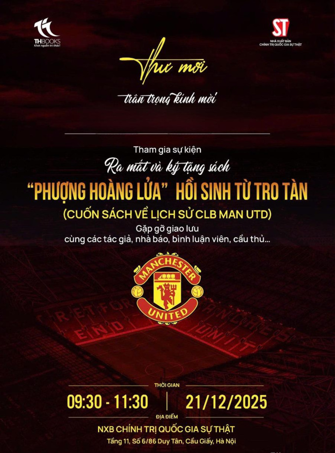 Cuốn sách “Phượng Hoàng lửa hồi sinh từ tro tàn” do nhiều tác giả thực hiện, chủ biên là nhà báo Phạm Việt Cường, Trưởng ban Nội dung Quốc tế của Tạp chí Bóng Đá. Sách do THBooks và NXB Chính Trị Quốc Gia Sự Thật hợp tác phát hành. Độc giả quan tâm có thể tới tham dự buổi gặp gỡ giao lưu cùng các tác giả, nhà báo, BLV, cầu thủ vào 09h30 Chủ Nhật (21/12/2025) tại NXB Chính trị Quốc gia Sự thật, Tầng 11, số 6/86 Duy Tân, Cầu Giấy, Hà Nội.