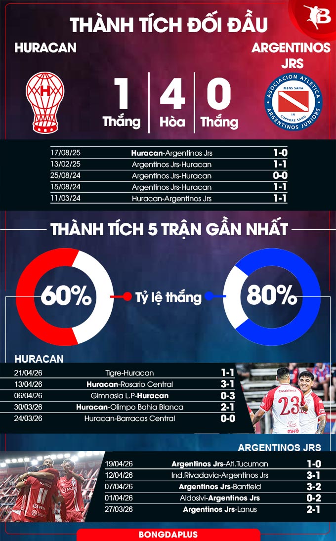 Ở trận đấu gần nhất, Hurucan và Argentinos Jrs đều không thua. Trong khi Huracan hòa 1-1 trước Tigre thì Argentinos Jrs đánh bại Atl.Tucuman với tỷ số 1-0.