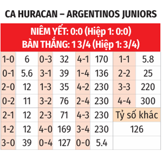 - Hiệp 1 có bàn thắng: 5/8 trận gần đây của Huracan có bàn thắng trong hiệp 1. Ngoài ra, 4/5 trận vừa qua của Argentinos Jrs chung kịch bản.