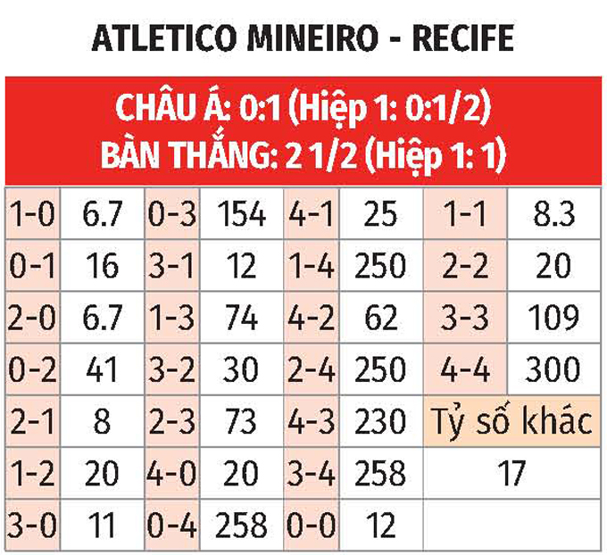 - Ít nhất 1 bàn ở hiệp 1: 5 trận chính thức gần nhất giữa Atletico Mineiro vs Recife có tối thiểu 1 lần lưới rung hiệp 1. 2/3 trận chính thức vừa xong của Atletico Mineiro và Recife có kịch bản tương tự. NHM nên đợi sau 15 phút đầu thì đặt niềm tin vào nhiều bàn hiệp 1.