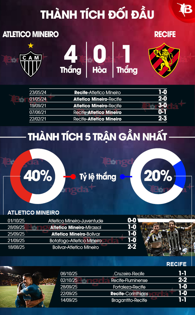 - Hai đội cùng ghi bàn: Atletico Mineiro đã thành công trong việc ghi bàn ở 4/7 trận chính thức mới đây, còn với Recife là ở 4/5 trận vừa qua. Chưa hết, Atletico Mineiro cũng ghi bàn ở 3/4 trận chính thức trên sân nhà gần nhất, còn Recife làm được điều tương tự ở 3/5 trận sân khách vừa qua. Với xu hướng như vậy, khả năng cao hai đội sẽ cùng tìm được đường vào khung thành của nhau.