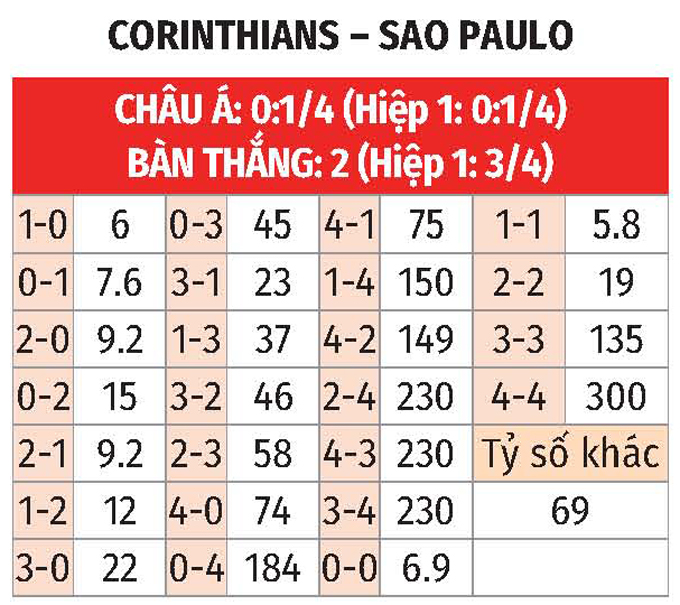 - Chẵn bàn thắng: 4 trận gần nhất của Corinthians vs Sao Paulo có tổng bàn thắng chia hết cho 2. Ngoài ra, 4/6 trận vừa xong của Sao Paulo đều chứng kiến điều tương tự.