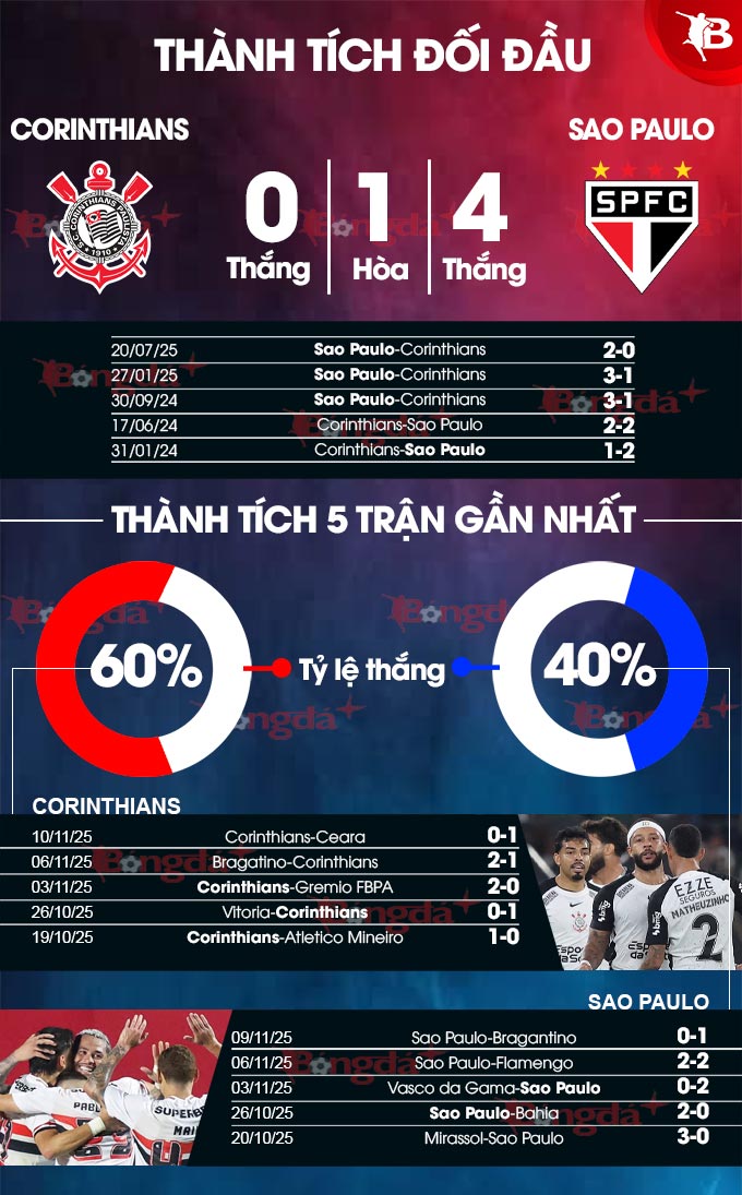 - Lưới rung 20 phút cuối: 3/4 trận đấu vừa qua của Corinthians có bàn thắng từ phút 70 trở đi. Chưa hết, 3/4 trận gần đây của Sao Paulo cũng chung kịch bản.