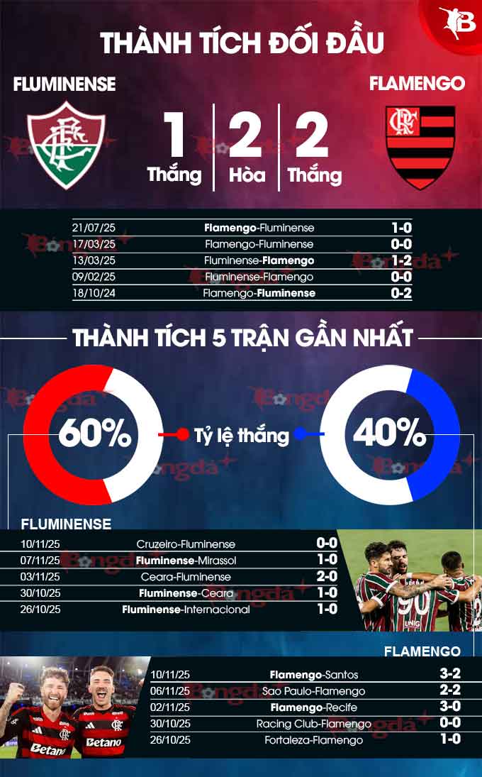 - Hai đội cùng ghi bàn: Fluminense đã thành công trong việc ghi bàn ở 3/5 trận gần nhất còn với Flamengo là ở 4/5 trận vừa xong. Bên cạnh đó, Fluminense cũng ghi bàn ở 5 trận gần nhất trên sân nhà còn Flamengo làm được điều đó ở 3/5 trận gần nhất trên sân khách. Với xu hướng như vậy, khả năng cao hai đội sẽ cùng tìm được đường vào khung thành của nhau.