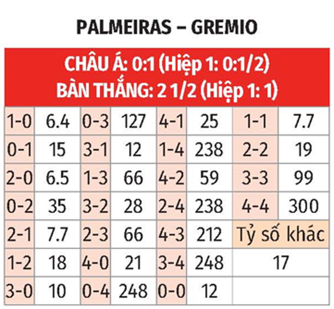 - Lẻ bàn thắng: 5/6 trận so tài vừa qua giữa 2 CLB có tổng bàn thắng không chia hết cho 2. Chưa hết, 8 trận liên tiếp vừa qua của Palmeiras lẫn 6/10 trận gần nhất khi Palmeiras tiếp Gremio trên sân nhà cũng chứng kiến điều tương tự.