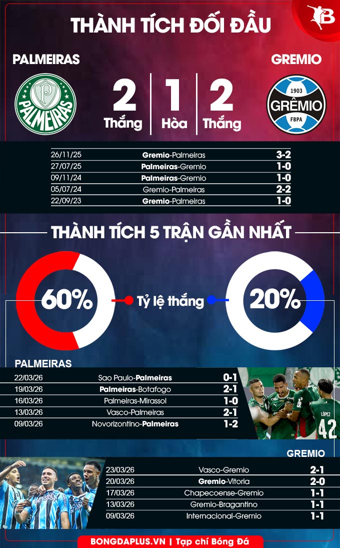 Tuy nhiên, Palmeiras đang chơi rất ổn trên sân nhà khi bất bại 10 trận vừa qua còn Gremio đá chưa hay ở sân khách thời gian này khi chỉ thắng 3/10 trận vừa xong.