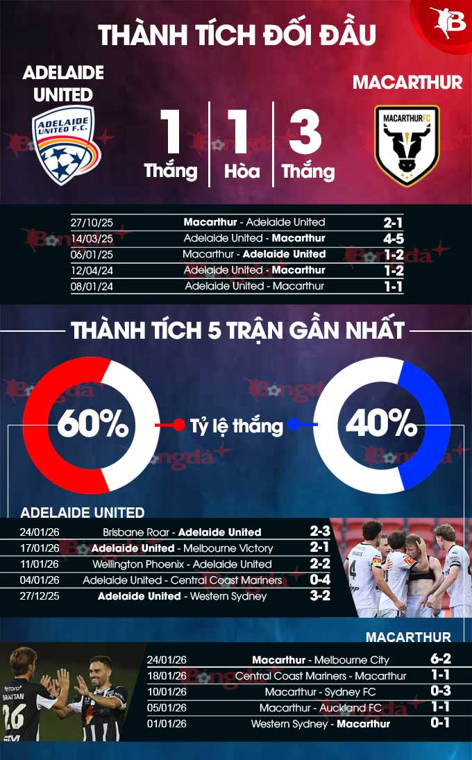 Nói vậy để thấy, Adelaide United đang phải đối mặt với đối thủ thực sự đáng gờm. Đây là đội bóng vừa gây ấn tượng mạnh bằng màn vùi dập Melbourne City với tỷ số lên đến 6-2. Việc Macarthur phải chơi trên sân khách không phải là vấn đề lớn với họ, do đội quân của HLV Mile Sterjovski đã duy trì được thành tích bất bại trong cả 6 chuyến hành quân xa nhà gần đây (thắng 4, hòa 2).