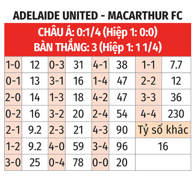 - Adelaide United thua theo châu Á: Macarthur thắng theo châu Á ở 7/9 trận gần nhất. Đá với Adelaide United thua theo châu Á ở 5/6 cuộc đụng độ gần đây giữa 2 bên, các vị khách là sự lựa chọn đáng tin hơn so với đội chủ nhà.