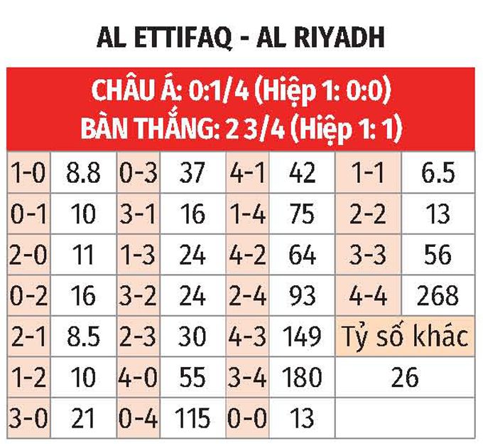 - Hiệp 1 có bàn thắng: 5/6 trận mới đây của Al Ettifaq có bàn thắng trong hiệp 1. Ngoài ra, 6/7 trận gần nhất của Al Riyadh chung kịch bản.