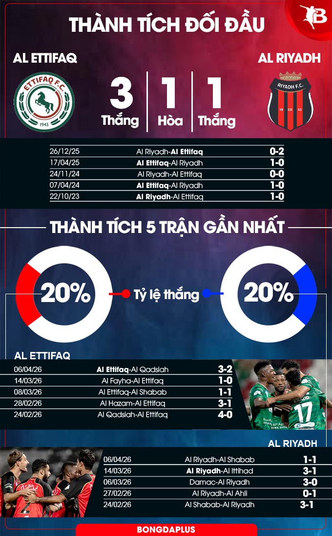 Trên BXH giải VĐQG Saudi Arabia 2025/26, Al Ettifaq đứng thứ 7 với 42 điểm còn Al Riyadh xếp thứ 16 khi có 20 điểm. So với Al Ettifaq, Al Riyadh đang nằm ở nhóm "cầm đèn đỏ".