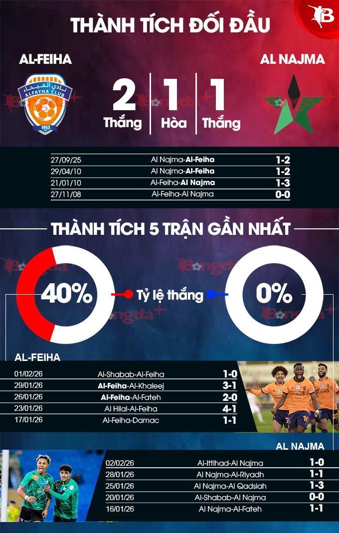 Đáng chú ý, Al Feiha đã không thắng nổi Al Najma trong cả 2 lần họ được tiếp đón đối phương trên sân nhà trước đây. Chỉ phải gặp Al Feiha đang gặp vấn đề về phong độ và không được lịch sử ủng hộ là cơ hội tốt để Al Najma hướng tới ít nhất một kết quả hòa.