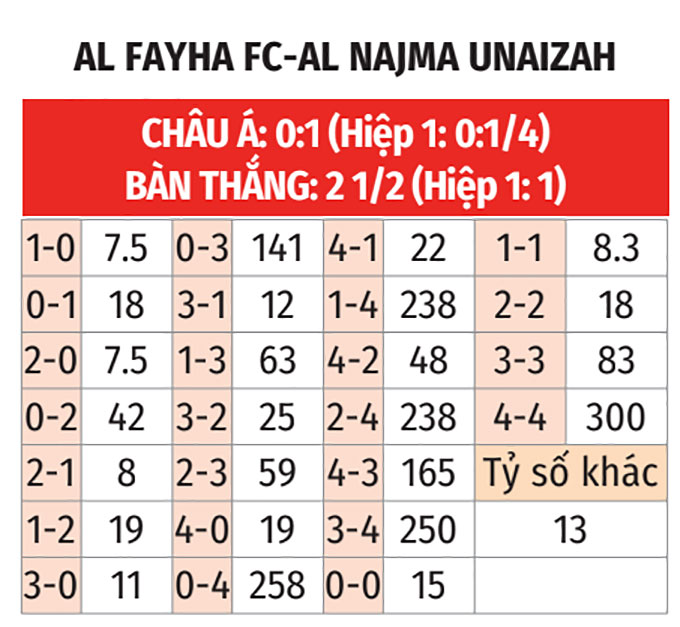 - Al Feiha thua theo châu Á: Al Feiha thua theo châu Á ở 9/11 trận gần nhất. Đá với Al Najma thắng theo châu Á ở 4/5 trận vừa qua, đội chủ nhà không phải là sự lựa chọn đáng tin cậy.