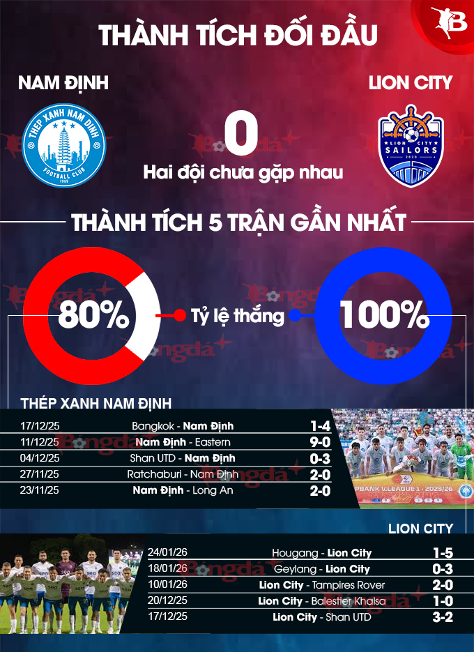 Thực tế, thành tích của Lion City trong thời gian qua không hề tệ, trong 5 trận đấu gần nhất, Lion City đã thắng cả 5 trận. Do đó, đấy là điều khiến đội bóng đến từ Singapore cảm thấy rất hứng khởi. Chưa kể thời gian qua, họ thi đấu liên tục chứ không bị gián đoạn như Nam Định, nên đấy cũng có thể xem là một lợi thế của Lion City trong cuộc so kè này. Vì vậy, trận đấu này được nhận định sẽ rất hấp dẫn và cũng là màn tái xuất của Nam Định sau thời gian nghỉ khá lâu.