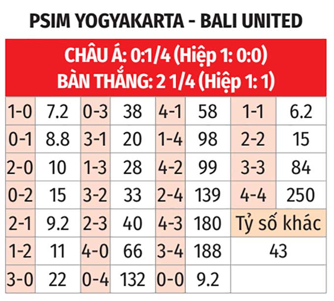 - Bali United thắng theo châu Á: Bali United thắng theo châu Á ở 6/8 trận gần nhất. PSIM Yogyakarta thua theo châu Á ở 3/4 trận vừa qua.