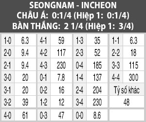 HIỆP 1 HÒA 0-0: 6/10 lần đối đầu gần đây giữa Seongnam và Incheon chứng kiến hiệp một không có bàn thắng nào được ghi. Hiện tượng tương tự cũng xuất hiện trong 5/8 trận gần đây của Seongnam và 4/7 trận gần đây của Incheon.