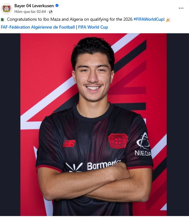 “Chúc mừng Ibo Maza và đội tuyển Algeria với tấm vé dự World Cup 2026!”, trang facebook chính thức của CLB Bayer Leverkusen gửi lời chúc tới tiền vệ sinh năm 2005.