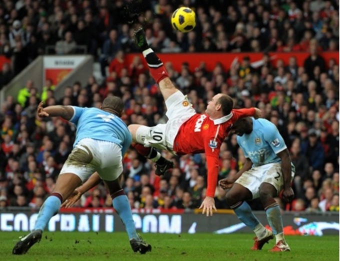 Ở trận derby thành Manchester diễn ra trên sân Old Trafford ở lượt về mùa giải 2010/11, tiền đạo Wayne Rooney đã lập siêu phẩm theo phong cách “xe đạp chổng ngược” để ấn định chiến thắng 2-1 cho MU. Bình luận viên của BBC khi đó đã phấn khích hét lên rằng, đó là pha ghi bàn đẹp nhất trong kỷ nguyên Premier League. Cụ thể, từ cú tạt bóng chếch bên cánh phải tưởng chừng sai địa chỉ của Nani, trong bối cảnh đang ở thế quay lưng lại khung thành của thủ môn Joe Hart và đang bị 2 hậu vệ kẹp chặt, Rooney lập tức ngả người móc bóng. Bóng đi vào góc xa khung thành của Man City, khiến Joe Hart chết lặng.