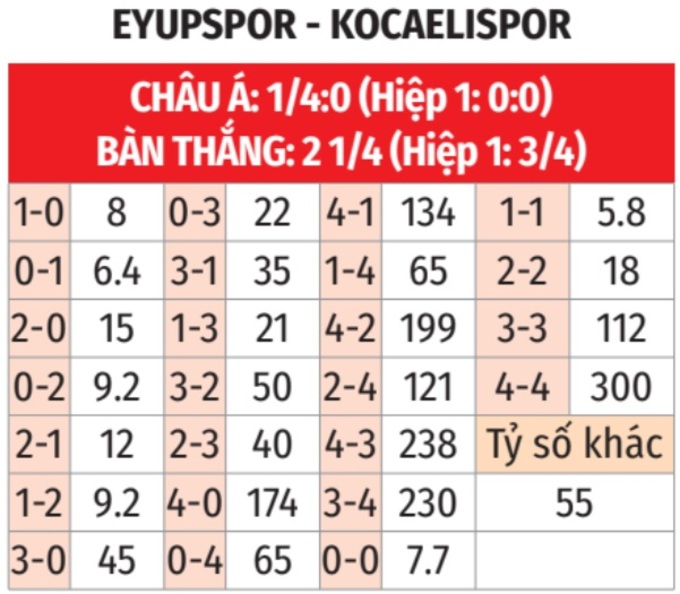 - Lẻ bàn thắng: 3/4 lần gặp giữa 2 đội gần đây kết thúc lẻ bàn thắng. Tình trạng tương tự xảy ra ở 4/5 trận sân nhà gần đây của Eyupspor và 4/5 trận mới nhất của Kocaelispor.