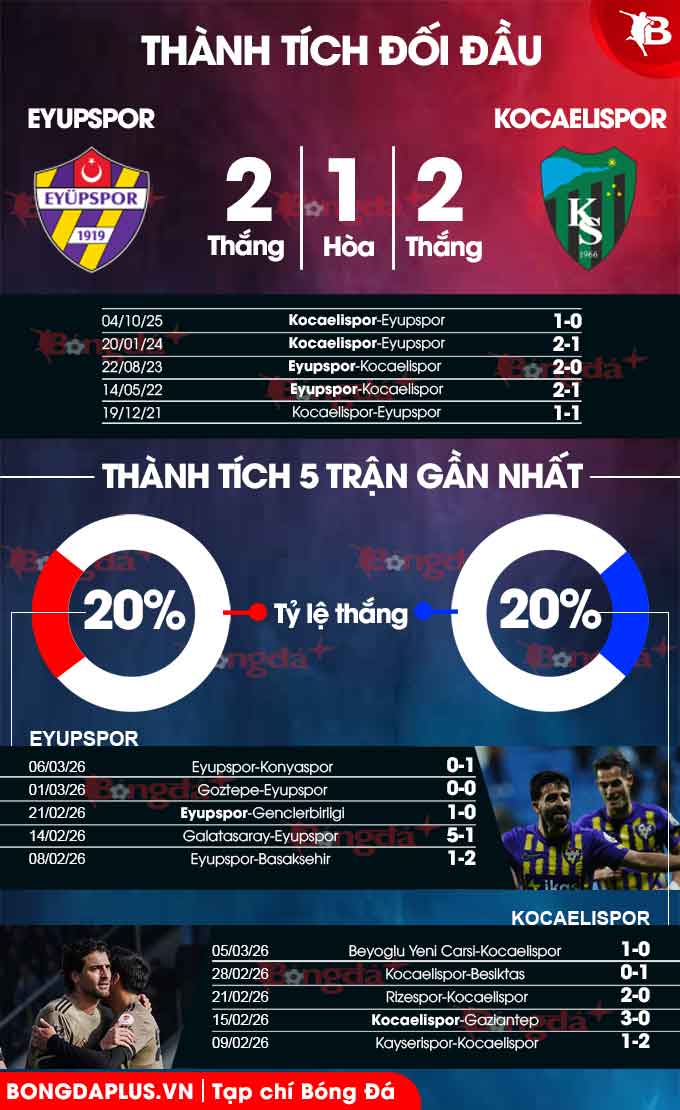 - Tối đa 2 bàn cả trận: 5/7 lần gặp giữa 2 đội gần đây tại các giải chính thức chỉ có nhiều nhất 2 bàn thắng. Tình trạng tương tự xảy ra ở 3 trận gần đây của Eyupspor và 5/6 trận mới nhất của Kocaelispor.