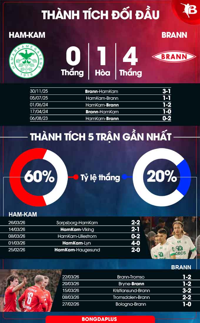 - 2 đội đều ghi bàn: HamKam ghi bàn ở 7/8 trận đấu gần đây. Brann cũng nổ súng" ở 5/6 trận gần nhất.