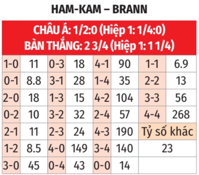 - Tối đa 1 bàn hiệp 1: 3/4 lần gặp giữa 2 đội gần đây chỉ có nhiều nhất 1 bàn thắng trong hiệp 1. Tình trạng tương tự xảy ra ở 7/9 trận gần đây của HamKam và 6/8 trận sân khách gần nhất của Brann.
