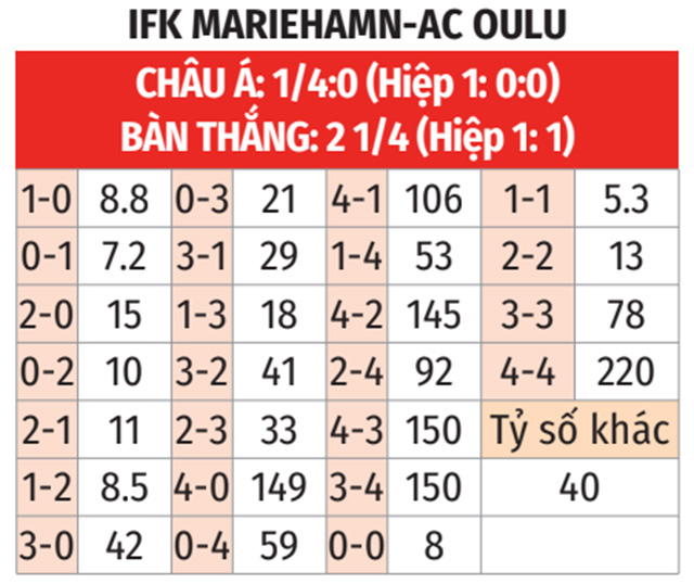- Chủ nhà thua kèo châu Á: Oulu đang rất có duyên vì họ đã thắng kèo cả 3 trận vừa qua. Trong 3 lần chạm trán Mariehamn gần đây, họ cũng giúp các nhà đầu tư đặt niềm tin vào mình thu được lợi nhuận. Với xu hướng như trên, sẽ là mạo hiểm nếu đứng về phía đội chủ nhà.