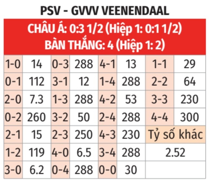 - Tối thiểu 4 bàn thắng: 6/8 trận sân nhà gần đây của PSV tại các giải đấu đều xuất hiện từ 4 bàn thắng trở lên. 5/8 trận vừa qua của GVVV Veenendaal xảy ra tình trạng tương tự.