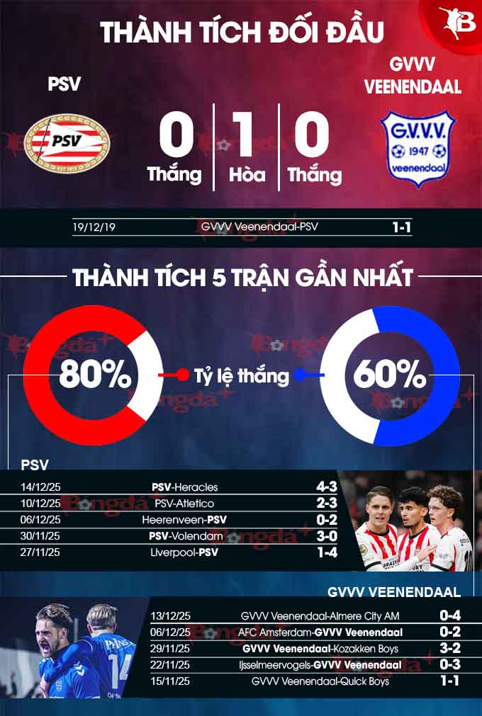 PSV Eindhoven đang thể hiện phong độ đáng sợ tại giải nội địa. Cụ thể, họ toàn thắng 10 trận liên tiếp gần đây tại giải nội địa, ghi tới 31 bàn thắng, nghĩa là trung bình mỗi trận có 3,1 lần “nổ súng”. Với lý do đó, PSV có lý do để tự tin bước vào trận tiếp đón GVVV Veenendaal.