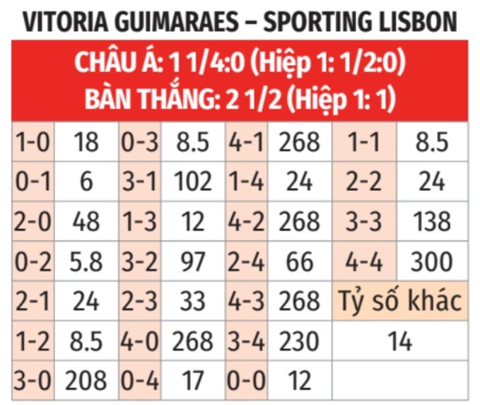 - Chẵn bàn thắng: 5/6 trận đối đầu giữa 2 đội gần đây trên sân của Vitoria Guimaraes kết thúc chẵn bàn thắng. 4/6 trận gần đây của Vitoria Guimaraes và 5 trận vừa qua của Sporting Lisbon tương tự.