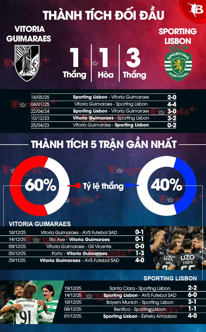 - Tối thiểu 3 bàn thắng: 5/7 lần đối đầu giữa 2 đội gần đây đều có tối thiểu 3 bàn thắng. Tình trạng tương tự xảy ra ở 3/4 trận gần đây của Vitoria Guimaraes ở giải VĐQG Bồ Đào Nha và 7/8 trận mới nhất của Sporting Lisbon.
