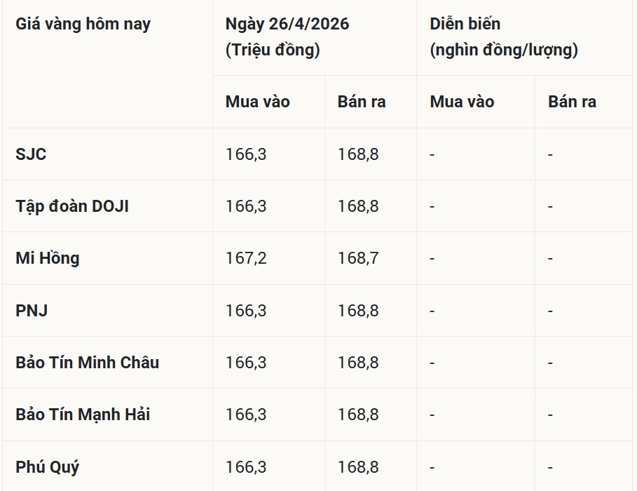 Tại Bảo Tín Minh Châu, giá vàng SJC giao dịch ở mức 166,2 – 168,8 triệu đồng/lượng (mua – bán), giữ nguyên ở chiều bán ra, với chênh lệch khoảng 2,6 triệu đồng/lượng. Trong khi đó, Phú Quý niêm yết giá quanh mức 166,3 – 168,8 triệu đồng/lượng, ổn định ở cả hai chiều mua vào và bán ra.