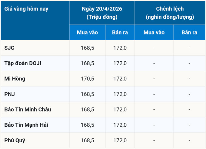Giá vàng SJC lúc 4h00 ngày 20/4/2026 được niêm yết 168,5 triệu đồng/lượng chiều mua và 172 triệu đồng/lượng chiều bán. So với tuần trước, giá mua giảm 900.000 đồng/lượng và giá bán giảm 400.000 đồng/lượng.