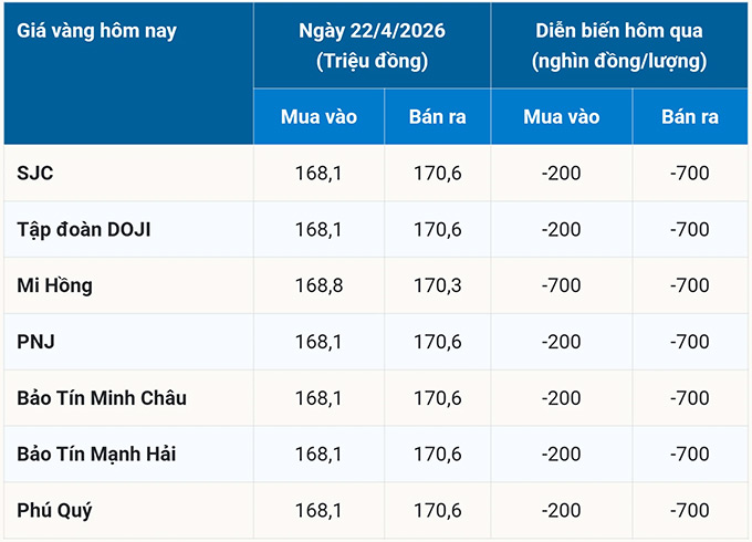 Giá vàng trong nước hôm nay 22/4/2026 ghi nhận lúc 04h00, giá vàng miếng SJC mua vào 168,1 triệu đồng/lượng, bán ra 170,6 triệu đồng/lượng, giảm 200.000 đồng chiều mua và 700.000 đồng chiều bán. Chênh lệch mua vào - bán ra của SJC duy trì 2,5 triệu đồng/lượng