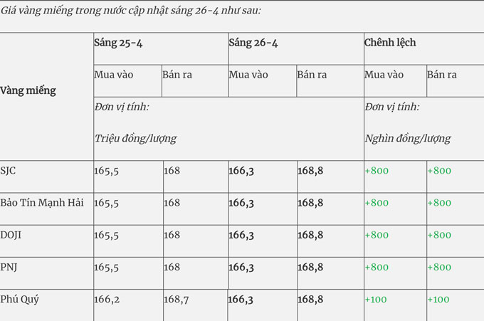 Sáng nay (26/4), giá vàng SJC và vàng nhẫn đã đảo chiều tăng trở lại, chấm dứt chuỗi ngày giảm liên tiếp. Giá vàng SJC bán ra tăng từ 100.000 - 800.000 đồng/lượng so với đầu giờ sáng qua, đạt mức 168,8 triệu đồng/lượng. Các thương hiệu lớn như Bảo Tín Mạnh Hải, Bảo Tín Minh Châu, Doji, Phú Quý,… cũng đồng loạt hồi phục, giá bán ra dao động từ 168,7 - 168,8 triệu đồng/lượng.