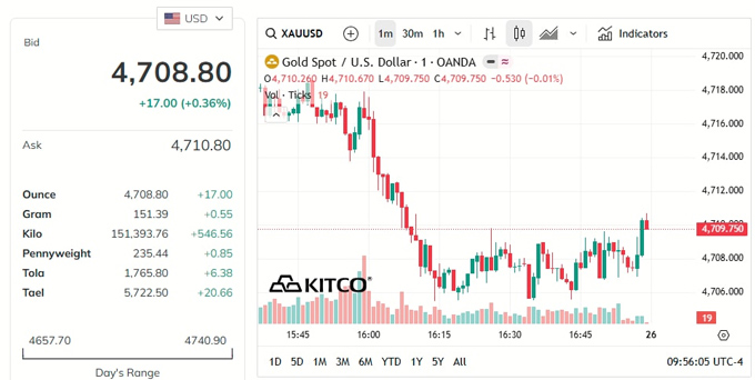 Theo dữ liệu từ Kitco, vào lúc 4h00 ngày 27/4 (giờ Việt Nam), giá vàng thế giới giao ngay được giao dịch quanh mức 4.708,8 USD/ounce, giảm 120,6 USD/ounce so với cuối tuần trước, tương đương mức giảm khoảng 2,5%.